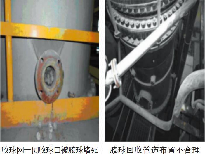 收球網一側收球口被膠球堵死;膠球回收管道布置不合理;