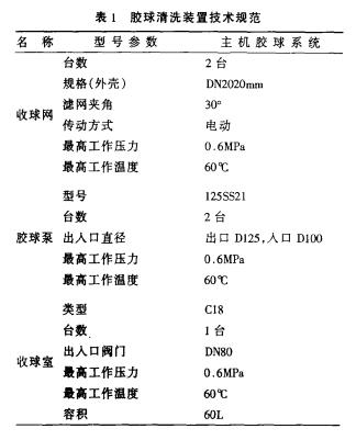 山西電廠捷制500MW機組主機凝汽器配套的膠球清洗裝置包括活動式收球網(wǎng)、膠球泵、裝球室、膠球再循環(huán)管路、膠球再噴射裝置、膠球再循環(huán)監(jiān)督裝置和差動壓力測量系統(tǒng)等。其作用是在機組運行過程中,供助水流將海綿膠球擠過凝汽器銅管,并不斷循環(huán),擦洗掉銅管內(nèi)的垢物,提高熱交換效率,降低凝汽器端差,提高汽輪機組真空.技術(shù)規(guī)范見表1。