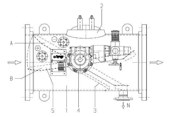 1收球器殼體;6收球網(wǎng)觀察孔;7驅(qū)動(dòng)機(jī)構(gòu);3導(dǎo)流板N出球管管口;4軸承+/-壓差測(cè)量系統(tǒng)接口;5網(wǎng)板半橢圓形收球網(wǎng);5將膠球引至出球管管口N。