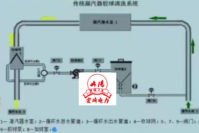 3、海綿剝皮膠球在系統(tǒng)中運行方式:膠球在系統(tǒng)中排隊方式流動,從收球網(wǎng)→膠球泵 →加球室→循環(huán)水進水管道→凝汽器水室入口→凝汽器水室出口→收球網(wǎng)循環(huán)。