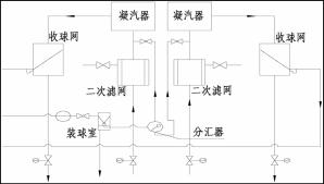 膠球清洗裝置由膠球、二次濾網、收球裝置、裝球室、分匯器、管道、閥門、膠球泵及膠球清洗程控裝置等設備組成。